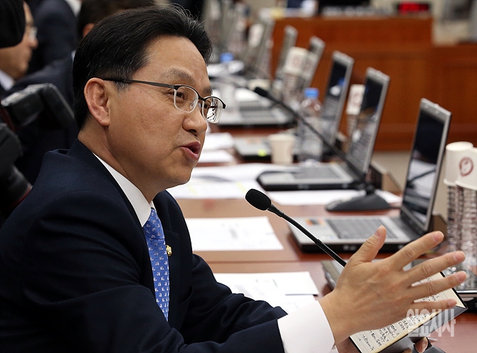 4일, 서울 여의도 국회에서 열린 연말정산 관련 긴급현안보고에서 새누리당 조명철 의원이 최경환 경제부총리 겸 기획재정부장관에게 질의하고 있다.