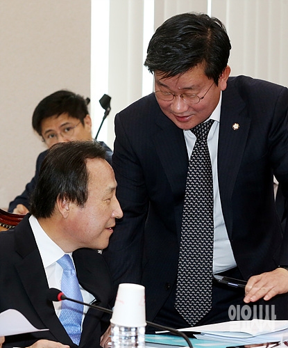 5일, 서울 여의도 국회 법제사법위원회 회의실에서 열린 '김영란법 관련' 전체회의에서 홍일표-전해철 여야 간사가 이야기를 나누고 있다.