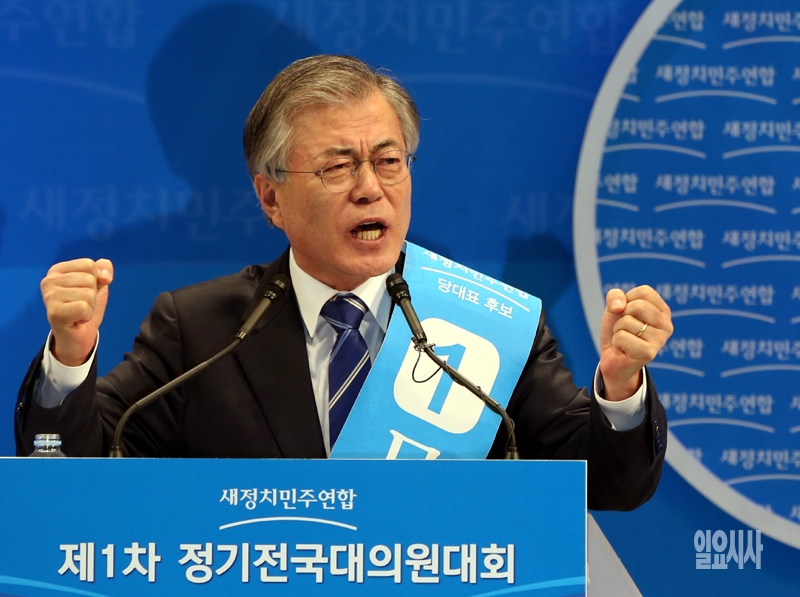 8일, 서울 잠실 올림픽체조경기장에서 열린 새정치민주연합 전당대회에서 문재인 후보가 정견발표 도중 지지를 호소하고 있다.
