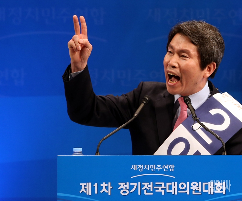 8일, 서울 잠실 올림픽체조경기장에서 열린 새정치민주연합 전당대회에서 이인영 후보가 정견발표 도중 지지를 호소하고 있다.
