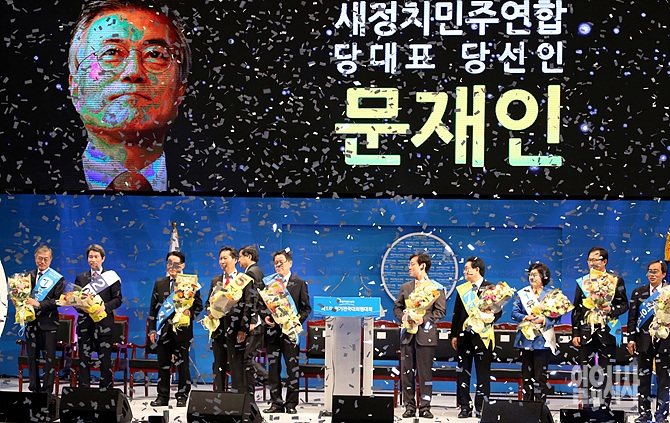8일, 서울 잠실 올림픽체조경기장에서 열린 새정치민주연합 전당대회에서 문재인 후보가 박지원·이인영 후보를 따돌리고 대표로 선출되자 전광판에 '새정치 당대표 당선인 문재인'이라고 표시되고 있다.