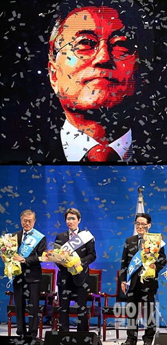 8일, 서울 잠실 올림픽체조경기장에서 열린 새정치민주연합 전당대회 직후 문재인 후보가 이인영·박지원 후보를 누르고 당 대표로 선출되고 있다.