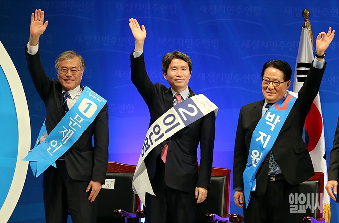 8일, 서울 잠실 올림픽체조경기장에서 열린 새정치민주연합 전당대회 직후 (왼쪽부터) 문재인·이인영·박지원 후보가 지지자들의 성원에 답례를 하고 있다.