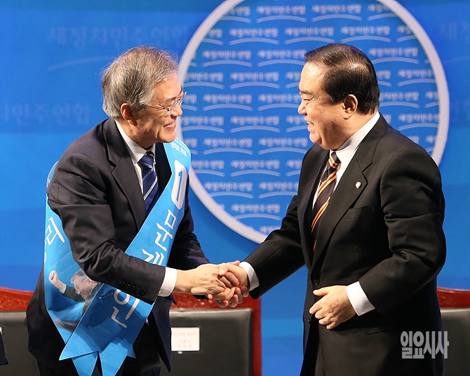 8일, 서울 잠실 올림픽체조경기장에서 열린 새정치민주연합 전당대회 직후 문재인 당선자(사진 왼쪽)가 문희상 비대위원장과 축하의 악수를 나누고 있다.