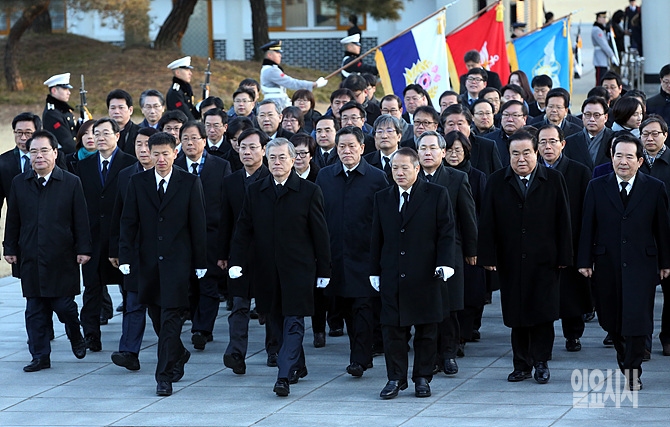 9일, 새정치민주연합 문재인 신임대표가 문희상 비대위원장 및 우윤근 원내대표, 정세균 상임고문 등 관계자들과 함께 서울 동작구 국립현충원 참배를 위해 입장하고 있다.