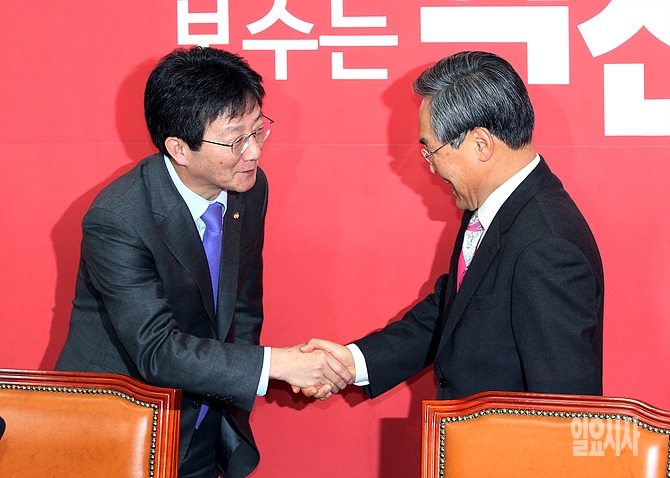 10일, 서울 여의도 국회에서 새누리당 유승민 원내대표와 새정치민주연합 우윤근 원내대표가 주례회동 직전, 악수를 나누고 있다.