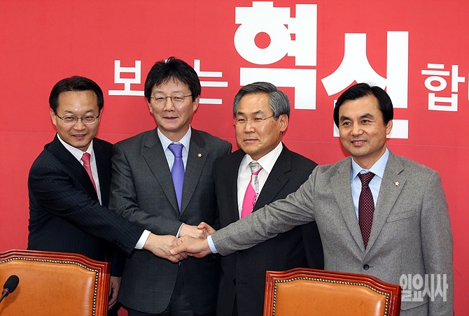 10일, 서울 여의도 국회에서 유승민·우윤근 여야 원내대표, 조해진·안규백 여야 원내수석부대표 등 원내지도부가 여야주례회동 직전, 악수를 나누고 있다.