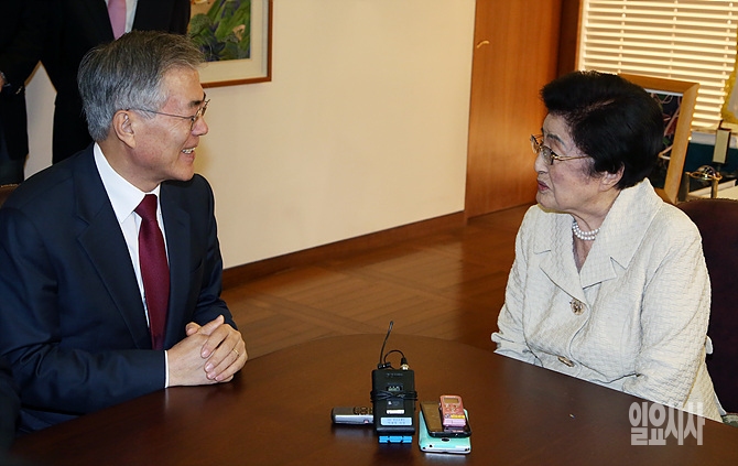11일, 문재인 새정치민주연합 대표와 최고위원들이 서울 마포구 동교동 김대중도서관을 방문한 자리에서 이희호 여사와 환담을 나누고 있다. (사진공동취재단)
