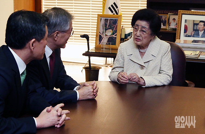 11일, 문재인 새정치민주연합 대표와 최고위원들이 서울 마포구 동교동 김대중도서관을 방문한 자리에서 이희호 여사와 환담을 나누고 있다. (사진공동취재단)