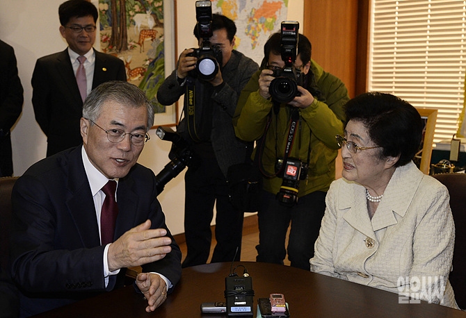11일, 문재인 새정치민주연합 대표와 최고위원들이 서울 마포구 동교동 김대중도서관을 방문한 자리에서 이희호 여사와 환담을 나누고 있다. (사진공동취재단)