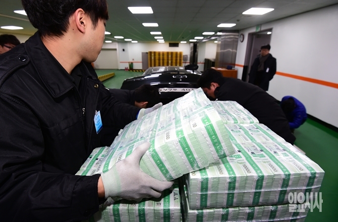 설을 일주일 앞둔 12일 오전 서울 중구 한국은행 본점에서 관계자들이 각 시중은행으로 보낼 설 자금을 이송차량으로 옮기고 있다.