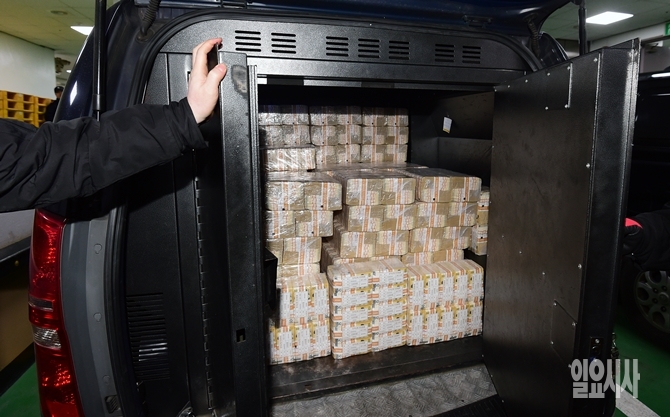 설을 일주일 앞둔 12일 오전 서울 중구 한국은행 본점에서 한 관계자가 각 시중은행으로 보낼 설 자금을 현금수송차량에 싣고 있다.