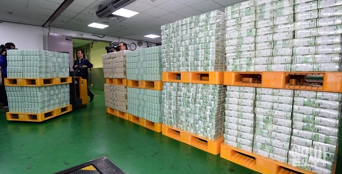 설을 일주일 앞둔 12일 오전 서울 중구 한국은행 본점에서 관계자들이 설 자금을 각 시중으로 보내기 위해 옮기고 있다.