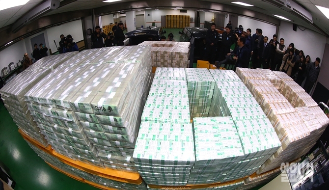 설을 일주일 앞둔 12일 오전 서울 중구 한국은행 본점에 각 시중은행으로 보내질 설 자금이 쌓여있다.