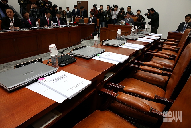 12일, 서울 여의도 국회에서 열린 이완구 국무총리 후보자에 대한 인사청문 보고서 채택을 위해 회의가 열린 가운데, 새정치민주연합 등 야당 청문위원들이 불참해 위원석이 텅 비어 있다.