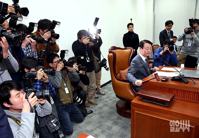 12일, 한선교 인사청문특별위원회 위원장이 야당 의원들이 불참한 가운데 서울 여의도 국회에서 열린 이완구 국무총리 후보자에 대한 인사청문 보고서 채택을 알리며 의사봉을 두드리고 있다.