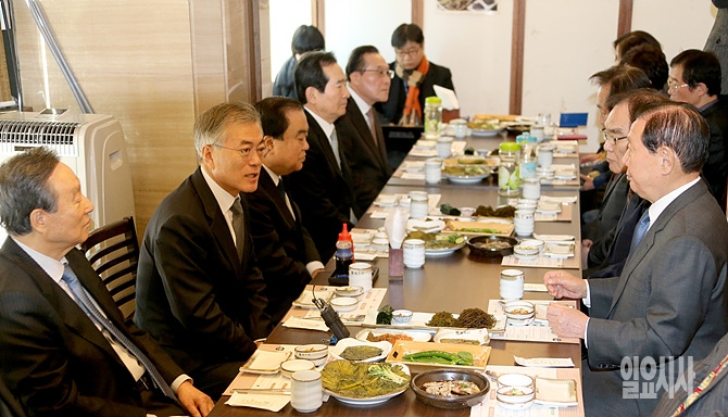 12일, 서울 여의도 한 모처의 중식당에서 새정치민주연합 문재인 대표를 비롯, 김원기·정대철·이해찬·정세균 등 상임고문단이 참석해 오찬이 열리고 있는 가운데, 문 대표가 발언하고 있다. (현장풀)