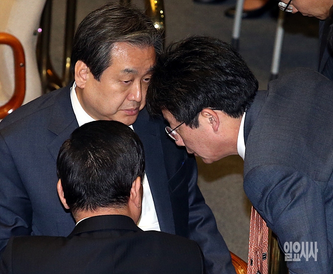 12일, 서울 여의도 국회 본회의장에서 새누리당 김무성 대표와 유승민 원내대표, 서청원 최고위원이 심각한 표정으로 이야기를 나누고 있다.