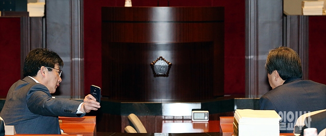 12일, 서울 여의도 국회에서 새누리당 김무성 대표(사진 오른쪽)과 유승민 원내대표가 의원총회 도중 이야기를 나누고 있다.