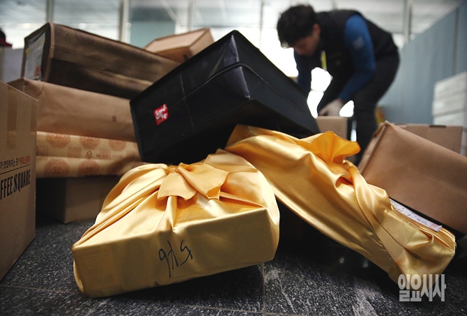 13일, 서울 여의도 국회 의원회관 로비에 의원들 앞으로 도착한 설명절 선물 택배들이 쌓여 있는 가운데, 택배 회사 직원이 분류에 열중하고 있다.