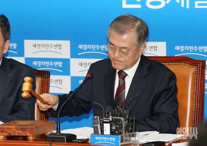 새정치민주연합 문재인 대표가 16일 오전 서울 여의도 국회에서 열린 당 최고위원회의에 참석해 의사봉을 두드리고 있다.