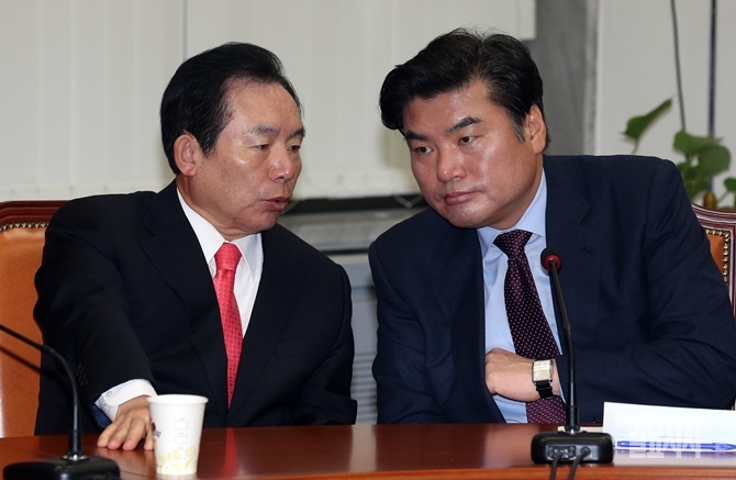 새누리당 이인제 최고위원(왼쪽)과 원유철 정책위의장이 16일 오전 서울 여의도 국회에서 열린 최고위원회의에 참석해 대화를 나누고 있다.