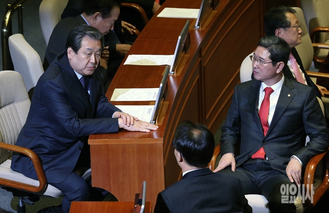 이완구 총리 후보자에 대한 임명동의안이 가결된 16일 오후 서울 여의도 국회에서 새누리당 김무성 대표를 비롯한 의원들이 결과에 대해 대화를 나누고 있다.