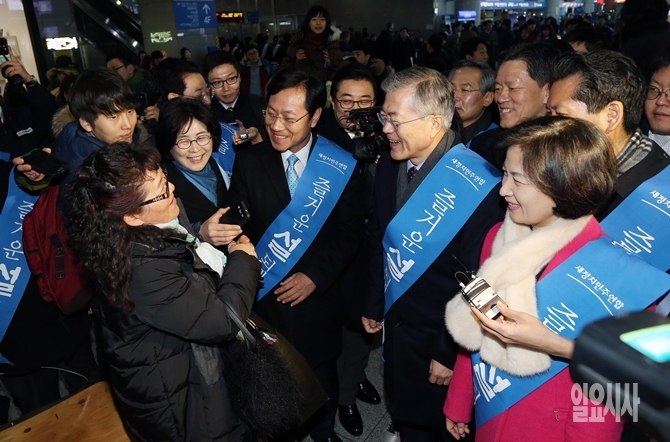 설 연휴를 하루 앞둔 17일 오전 새정치민주연합 문재인 대표를 비롯한 지도부가 서울 용산역을 찾아 귀성객들에게 귀성 인사를 하고 있다.