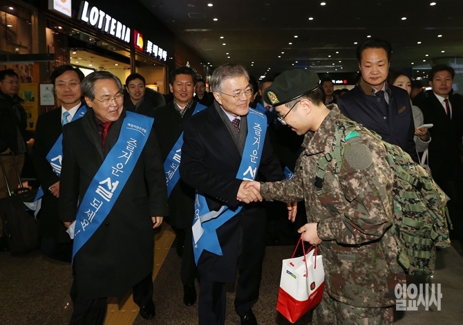 설 연휴를 하루 앞둔 17일 오전 새정치민주연합 문재인 대표를 비롯한 지도부가 서울 용산역을 찾아 귀성객들에게 귀성 인사를 하고 있다.