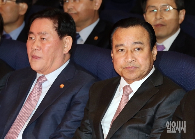 이완구 신임 국무총리(오른쪽)와 최경환 경제부총리가 17일 오후 세종로 정부서울청사에서 열린 '제43대 국무총리 취임식'에서 나란히 앉아 있다.