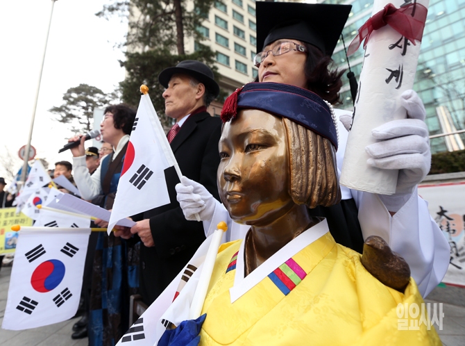 독도국민연대 회원들이 23일 오전 서울 종로구 중학동 일본대사관 앞에서 일본의 '다케시마의 날' 행사를 비롯한 독도 도발을 규탄하는 기자회견을 열고 있다.
