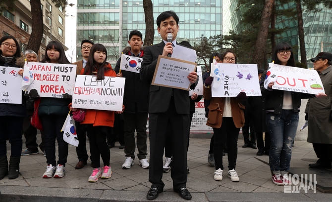 독도사랑회 회원들과 여중생들이 23일 오전 서울 종로구 중학동 일본대사관 앞에서 '일본 다케시마의 날 규탄 기자회견'을 열고 있다.
