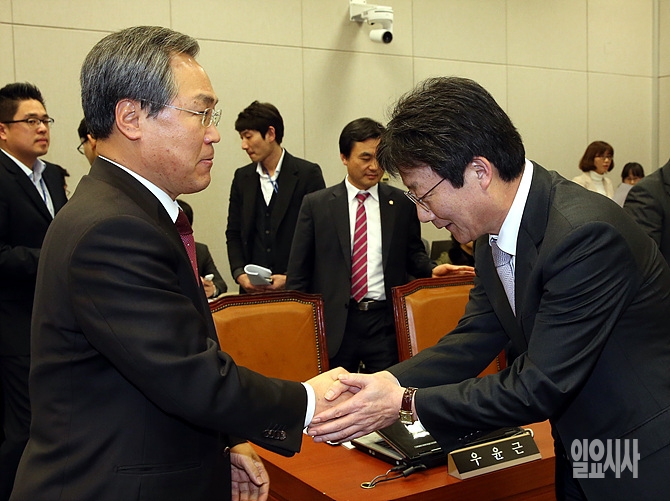 23일, 서울 여의도 국회 운영위원회 회의실에서 전체회의 직전, 새정치민주연합 우윤근 의원(원내대표, 사진 왼쪽)이 유승민 운영위원장과 악수를 나누고 있다.