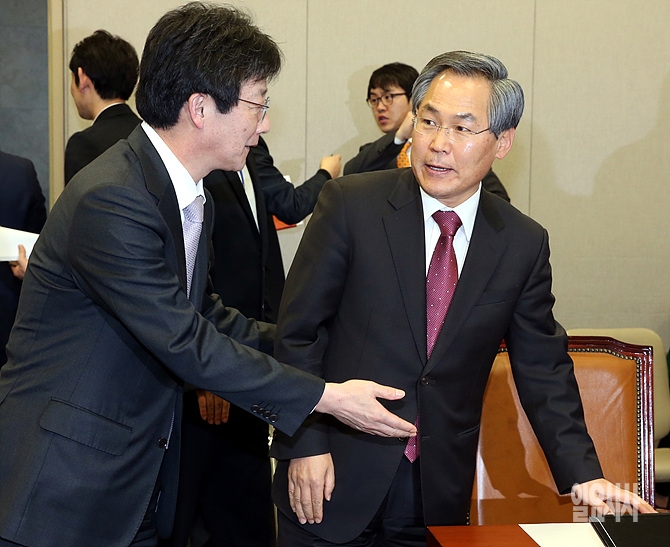 23일, 서울 여의도 국회 운영위원회 회의실에서 전체회의 직전, 유승민 운영위원장(새누리당, 사진 왼쪽)이 새정치민주연합 우윤근 의원(원내대표)에게 자리를 건네고 있다.