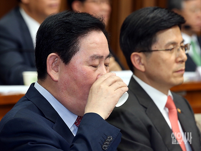 24일, 서울 여의도 국회에서 열린 해외자원개발 진상조사 특위 회의 도중 최경환 경제부총리 겸 기획재정부장관이 물을 들이키고 있다.