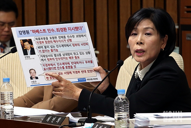 24일, 서울 여의도 국회에서 열린 해외자원개발 진상조사 특위 회의 도중 새정치민주연합 최민희 의원이 준비자료를 통해 MB정부 시절 하베스트 인수가 현 최경환 경제부총리 겸 기획재정부장관의 지시였다고 주장하고 있다.