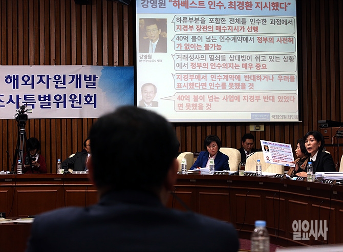 24일, 서울 여의도 국회에서 열린 해외자원개발 진상조사 특위 회의 도중 최민희 새정치민주연합 의원이 최경환 경제부총리 겸 기획재정부장관의 하베스트 인수 의혹에 대해 준비자료를 제시하고 있다.