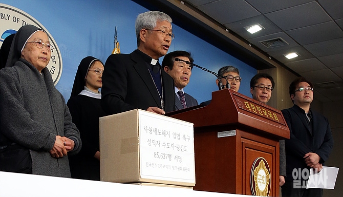 24일, 서울 여의도 국회 정론관에서 한 종교단체 종교인들이 한국 천주교 사제·수도자·평신도 85, 637명의 서명용지 국회 전달식을 갖고 사형제 폐지의 입법을 촉구하고 있다.
