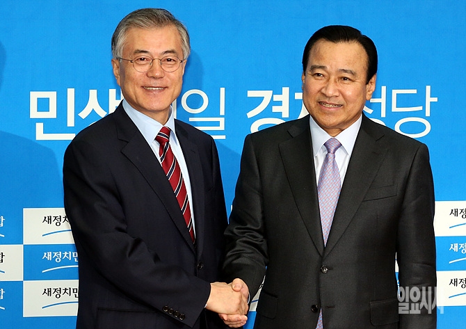 24일, 서울 여의도 국회 새정치민주연합 문재인 대표(사진 왼쪽)를 예방한 이완구 총리가 문 대표와 악수를 나누고 있다.