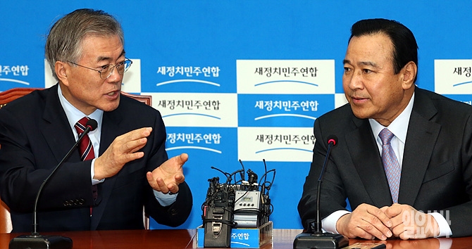 24일, 서울 여의도 국회 새정치민주연합 문재인 대표(사진 왼쪽)를 예방한 이완구 총리가 문 대표와 이야기를 나누고 있다.