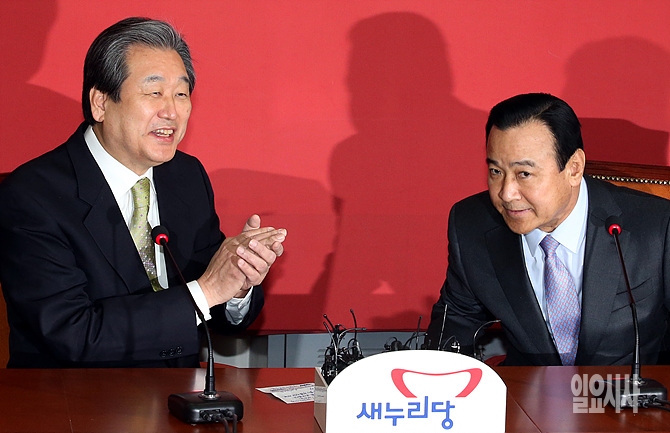 24일, 서울 여의도 국회 새누리당 김무성 대표(사진 왼쪽)를 예방한 이완구 국무총리가 김 대표로부터 박수를 받고 있다.