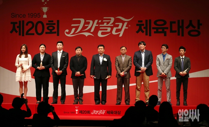 24일 오전 서울 중구 소공동 웨스틴조선호텔에서 열린 '제20회 코카콜라 체육대상 시상식'에서 역대 최우수선수상 수상자들이 기념 촬영을 하고 있다. 왼쪽부터 리듬체조의 손연재, 역도의 장미란, 탁구의 유승민, 체조의 이주형, 마라톤의 황영조, 마라톤의 이봉주, 펜싱의 김영호, 복싱의 이옥성, 체조의 양학선.