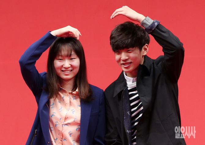 24일 오전 서울 소공동 웨스틴조선호텔에서 열린 ‘제20회 코카콜라 체육대상’ 시상식에서 신인상을 수상한 쇼트트랙의 최민정(왼쪽) 사격의 김청용이 수상 뒤 세리머니를 하고 있다.