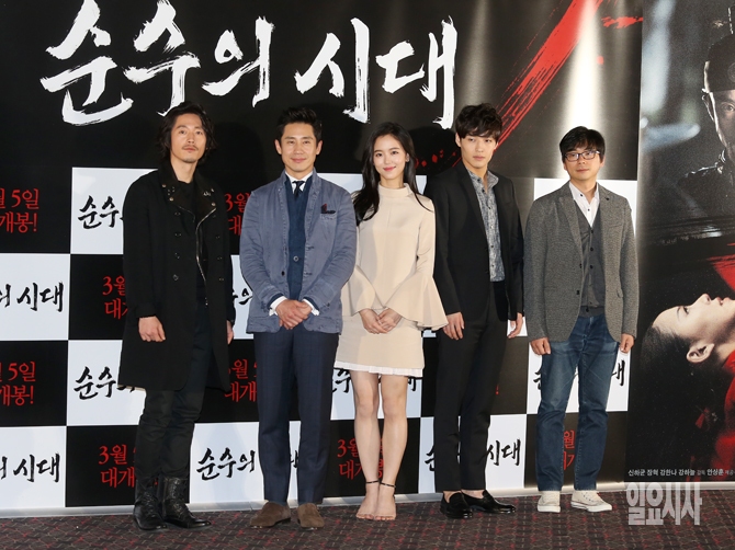 24일 오후 서울 성동구 행당동 CGV왕십리에서 영화 ‘순수의 시대(감독 안상훈)’ 언론시사회 에서 출연진들이 포즈를 취하고 있다. 왼쪽부터 배우 장혁, 신하균, 강한나, 강하늘, 안상훈 감독.