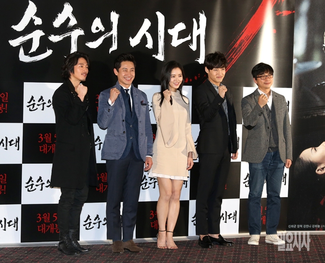 24일 오후 서울 성동구 행당동 CGV왕십리에서 영화 ‘순수의 시대(감독 안상훈)’ 언론시사회 에서 출연진들이 포즈를 취하고 있다. 왼쪽부터 배우 장혁, 신하균, 강한나, 강하늘, 안상훈 감독.