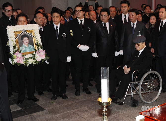 25일 오전 서울 송파구 서울아산병원 장례식장에서 거행된 김종필 전 총리의 부인 故 박영옥 여사 발인식에서 김 전 총리가 고인의 마지막 길을 배웅하고 있다. 척추협착증과 요도암 투병 끝에 지난 21일 86세로 세상을 떠난 고인은 충남 부여에 위치한 가족 묘소에 안장된다.