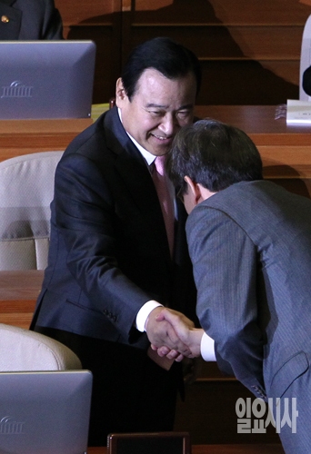 이완구 신임 국무총리가 제331회 국회(임시회) 본회의가 열린 25일 오전 서울 여의도 국회 본회의에 참석해 의원들과 인사를 나누고 있다.