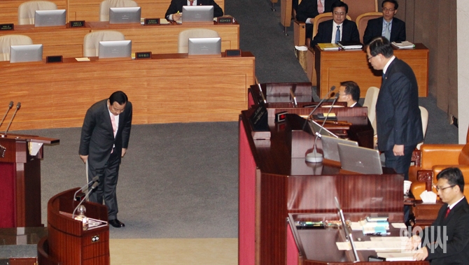 이완구 신임 국무총리가 제331회 국회(임시회) 본회의가 열린 25일 오전 서울 여의도 국회 본회의장에서 인사말을 하기에 앞서 정의화 국회의장에게 인사하고 있다.