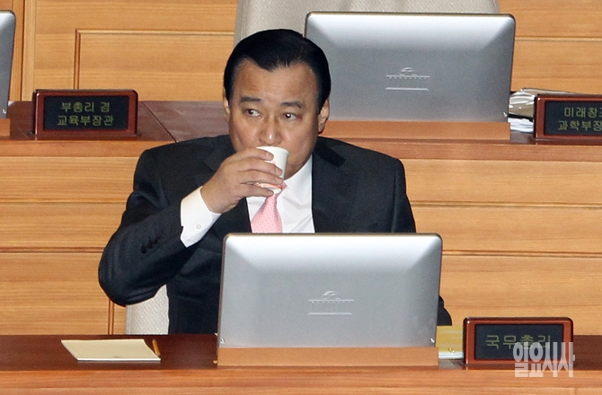 이완구 신임 국무총리가 제331회 국회(임시회) 본회의가 열린 25일 오전 서울 여의도 국회 본회의장에서 물을 마시고 있다.