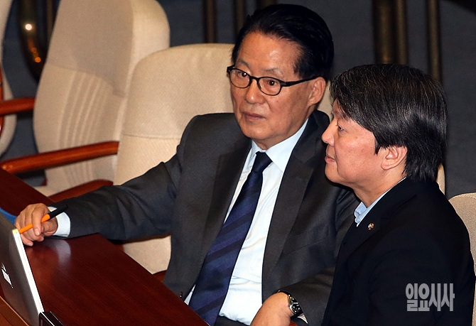 25일, 서울 여의도 국회 본회의장에 새정치민주연합 박지원 의원(사진 왼쪽)과 안철수 의원이 본회의에 참석해 있다.